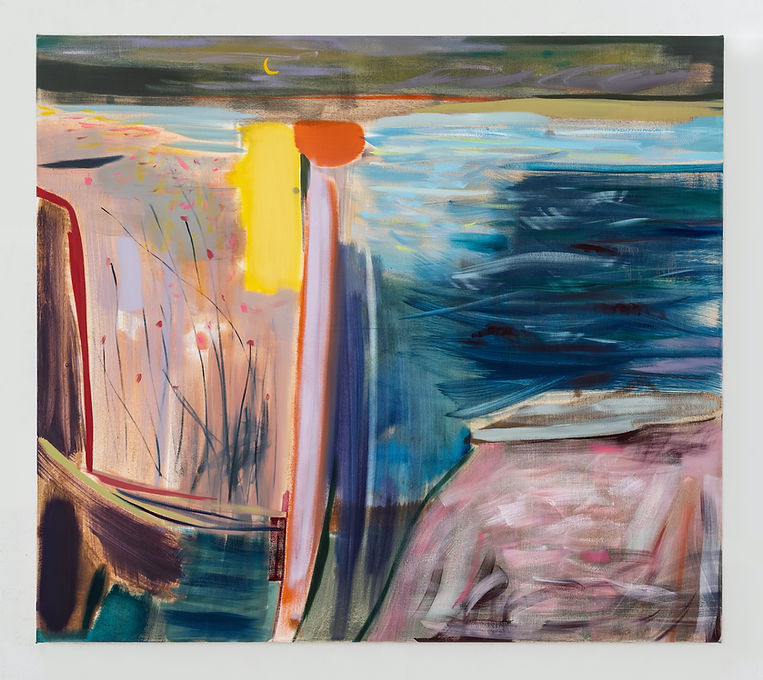 Horizon lines become a fading boundary. Sky, earth, and water blur. Forms from the natural world are discernible, yet move in and out of focus. Dichotomies abound. They alternate between feeling serene and agitated. Layers of vibrant, at times violent, hues of colors and lush, determined brushstrokes give the surfaces a feeling of churning, of perpetual motion.