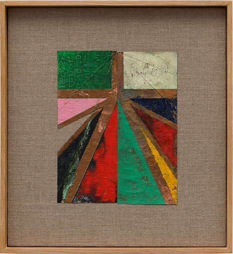 The artworks themselves are elusive to categorize. Pieces of painted copper foil float over color fields of linen. Some text is visible but it’s mostly indecipherable. Collapsed steles or scraps of ancient scrolls come to mind. The pplanes are folded as paper airplanes—objects that figuratively carry messages into the world, sailing outward on air currents just as breaths and spoken language drift into space. Worn creases, cut up fragments, and weathered paint make it clear that time is a material component here, but vibrant colors and sharp geometry situate them in the present.